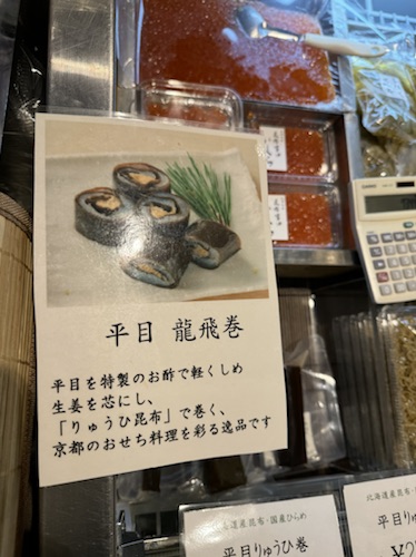 縁起物 平目の龍飛巻(平目を昆布で巻いている) 販売のお兄さんによれば 昆布屋で昆布巻きを作るのは年末だけとか 何故って